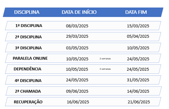 Atenção: As provas EaD terão início aos sábados. As exceções são a 2ª chamada e a Recuperação, que continuarão começando na segunda-feira.