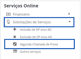 Entre em seu Colaborar – AVA aproximadamente ao centro superior de sua tela no campo “Serviços Online” no ícone “Solicitações de Serviços” e após “Segunda chamada de prova” para realizar sua solicitação, caso tenha-se ausentado em sua 1ª chamada.